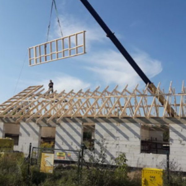 Ostatnim elementem prac budowlanych i doprowadzenie budowli do stanu surowego otwartego jest oczywiście dach. Instalujemy stropy monolityczne, terivę, montujemy więźby i wiązary dachowe oraz pokrycie dachu.